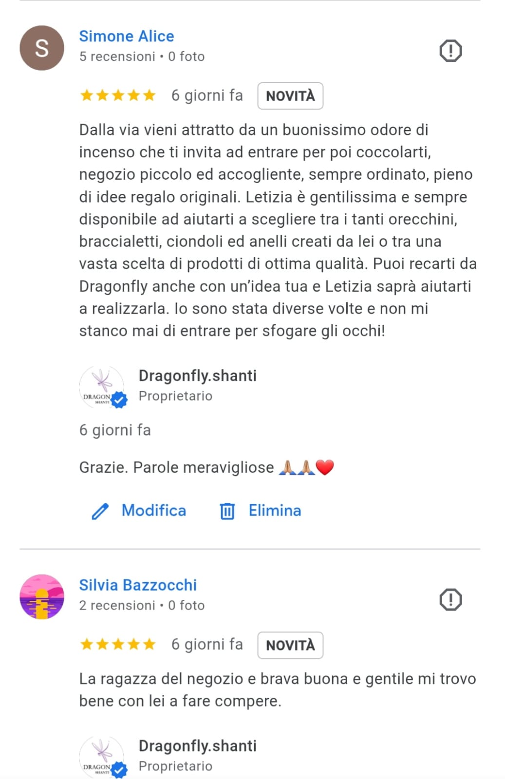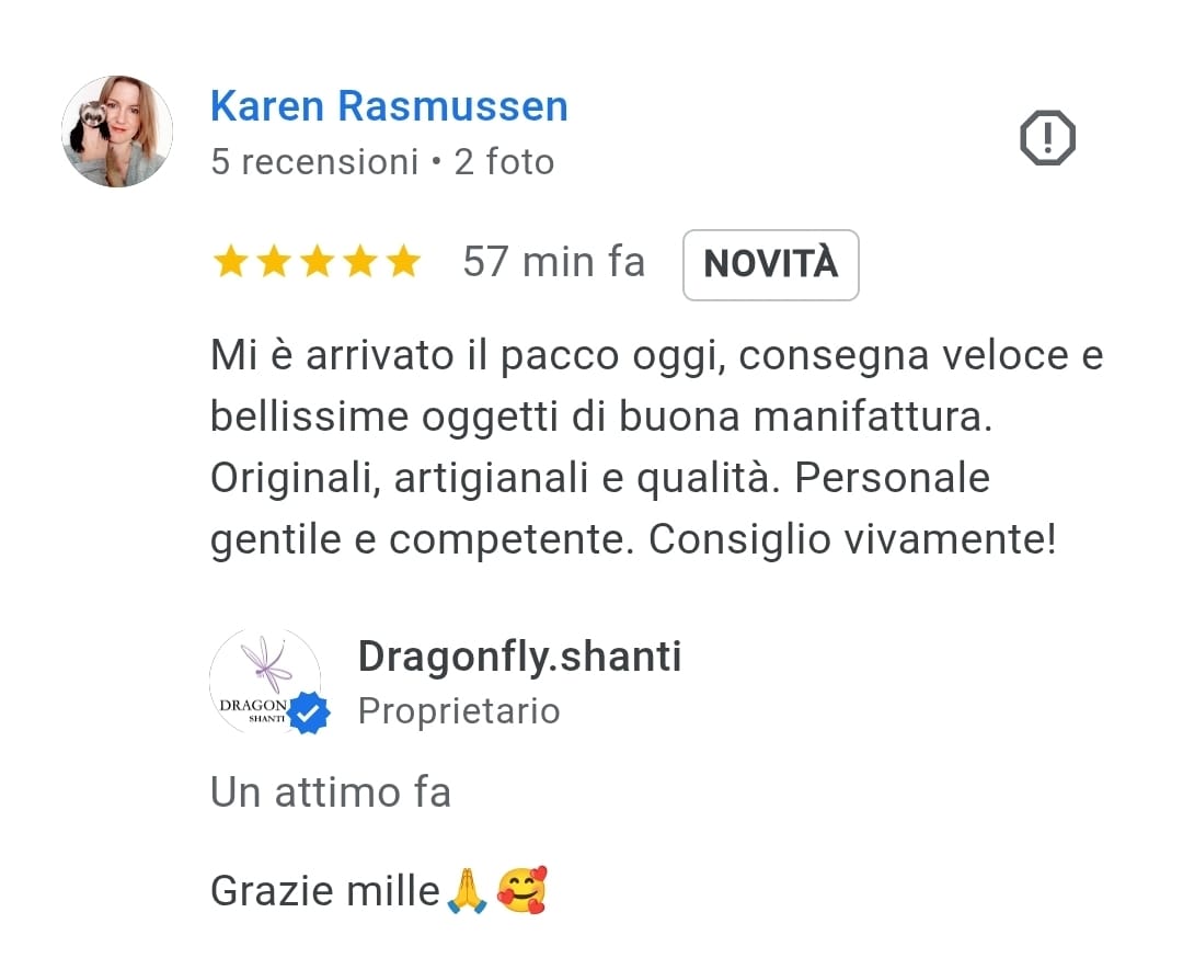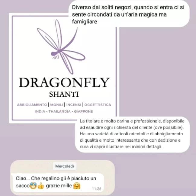 Dragonfly.shanti importa articoli dal Mondo e la maggior parte dei Monili viene realizzata a mano, direttamente in negozio per voi. Seguendo anche i nostri Social (Fb e Instagram) può capitare di vedere articoli non postati sullo shop-online. Potreste anche vedere articoli sullo shop che risultano non più disponibili. In entrambi i casi contattateci! Ricordiamo che Dragonfly.shanti punta sull’Unicità pertanto negli anni abbiamo sempre comprato articoli anche simili, ma mai uguali. Così come per i Monili cerchiamo di non ricrearli identici, ci piace pensare che siano quasi pezzi unici. Tuttavia cercheremo di accontentarvi nel miglior modo possibile e ove fattibile, riproporvi lo stesso oggetto da voi richiesto.