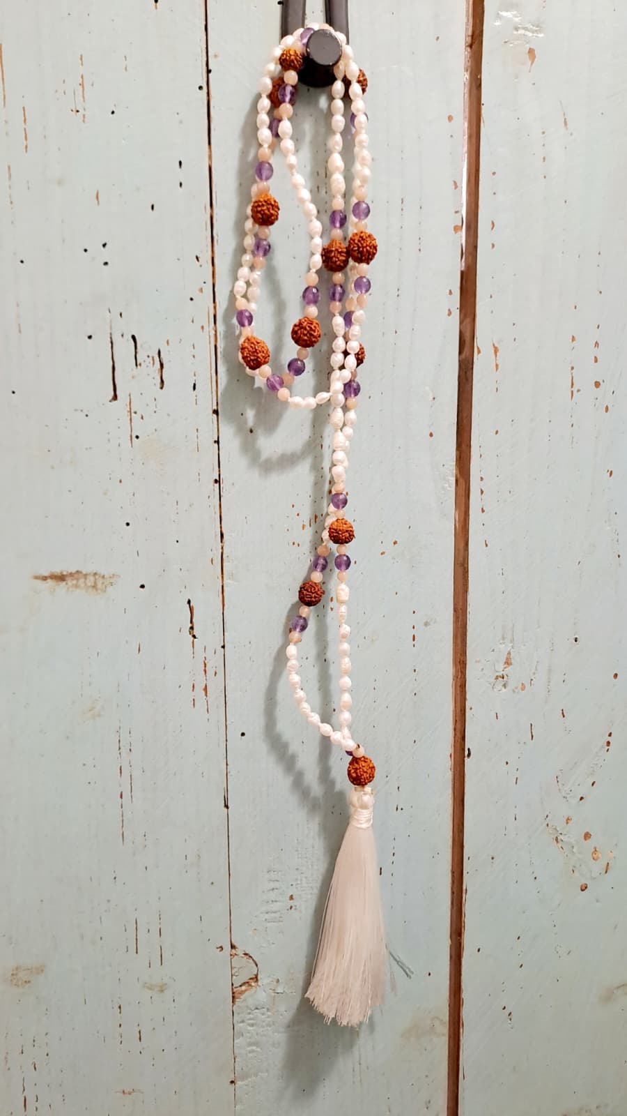 Collana Mala realizzata in Perle di Fiume “chicco di riso”, Rudraksha & Pietra dura - Ametista e Pietra di Luna. La cliente voleva una Mala che la identificasse, con proprietà energetiche ben specifiche e che fosse ideato solo per lei.
